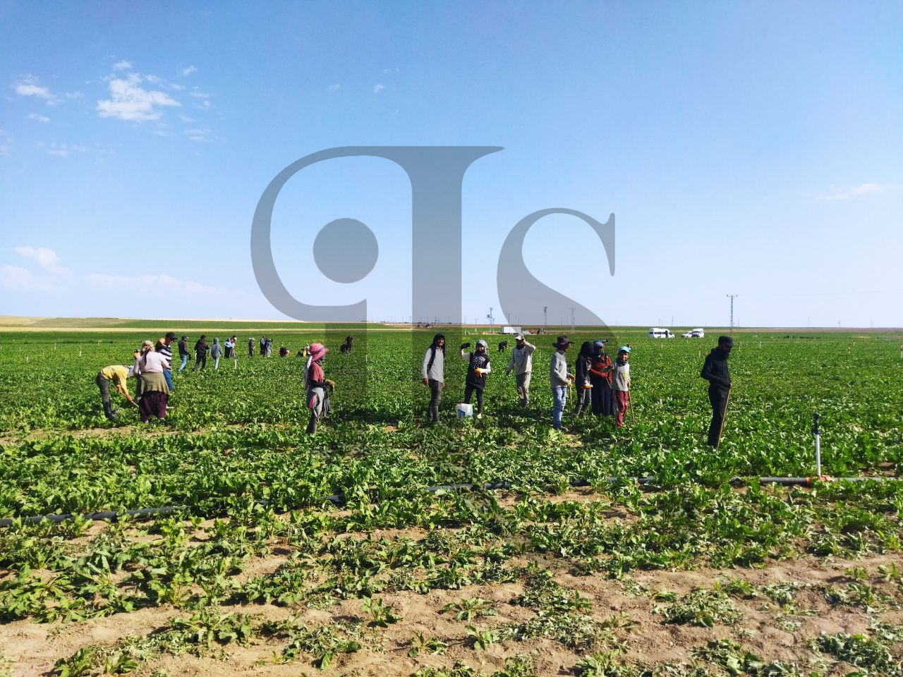 Sono ormai vicina a loro. Un uomo giovane dal colore della pelle più chiara mi viene incontro. Non vuole assolutamente essere fotografato, ma mi dà il permesso di riprendere i braccianti. Sono tutti profughi siriani giovanissimi: 13, 14, 15, 16, 17 anni. Sono festosi e mi vengono incontro con il permesso del "padrone" che è curdo. Mi dice che la terra è di sua proprietà e coltivano con mezzi arcaici sotto un sole torrido le barbabietole da zucchero. Questa farina bianca è usata in larga misura per addolcire il tipico tè turco.