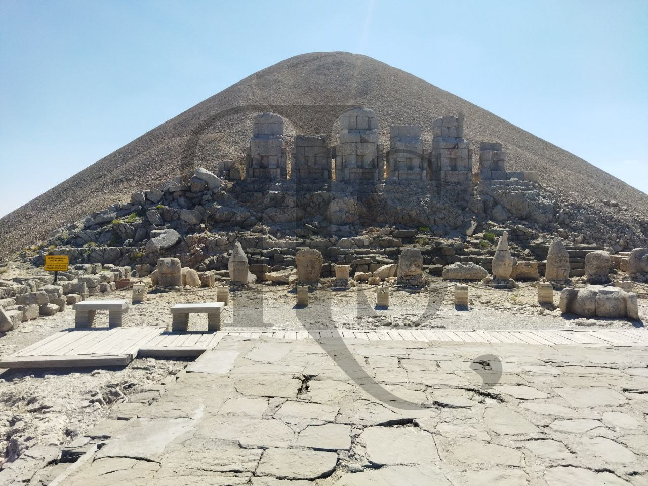 Saliamo al Nemrut Dagi, patrimonio UNESCO. Il paesaggio è incantevole e nonostante l'altezza, 2150 m, fa molto caldo. La cima assunse l'aspetto attuale quando un sovrano megalomane dell'età preromana ne commissionò la costruzione di due terrazze artificiali e ordinò di costruire diverse statue monumentali raffiguranti se stesso e le divinità "sue parenti". Purtroppo i terremoti hanno decapitato gran parte delle statue e oggi questi busti colossali siedono con davanti le loro teste alte 2 m che li osservano dal basso.