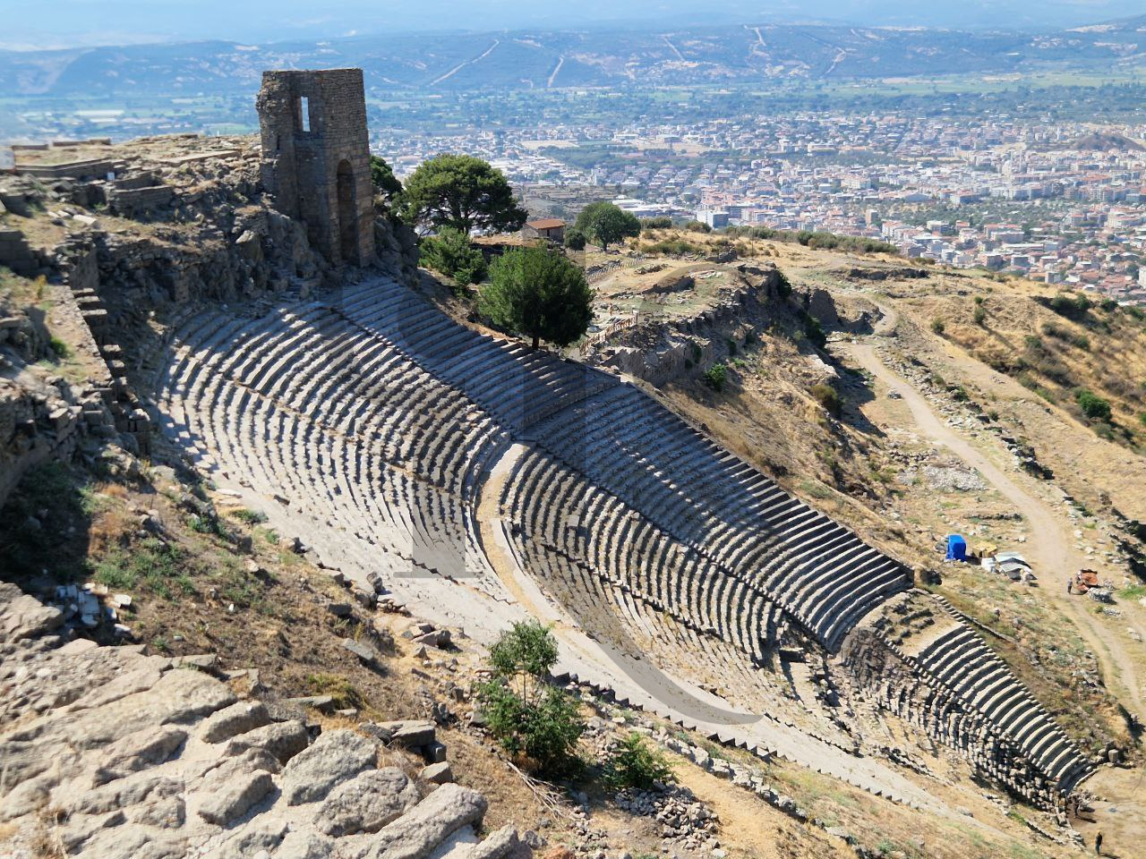 Arriviamo prima dei turisti. Qui rispetto ad Efeso ci sono meno resti. Gradevole la vista che spazia sulla città di Pergamo. Pochi sono i controlli tanto che la gente si arrampica sulle varie parti del sito per farsi fotografare.