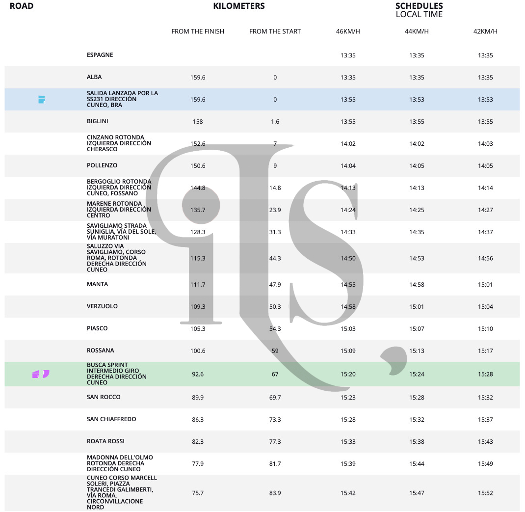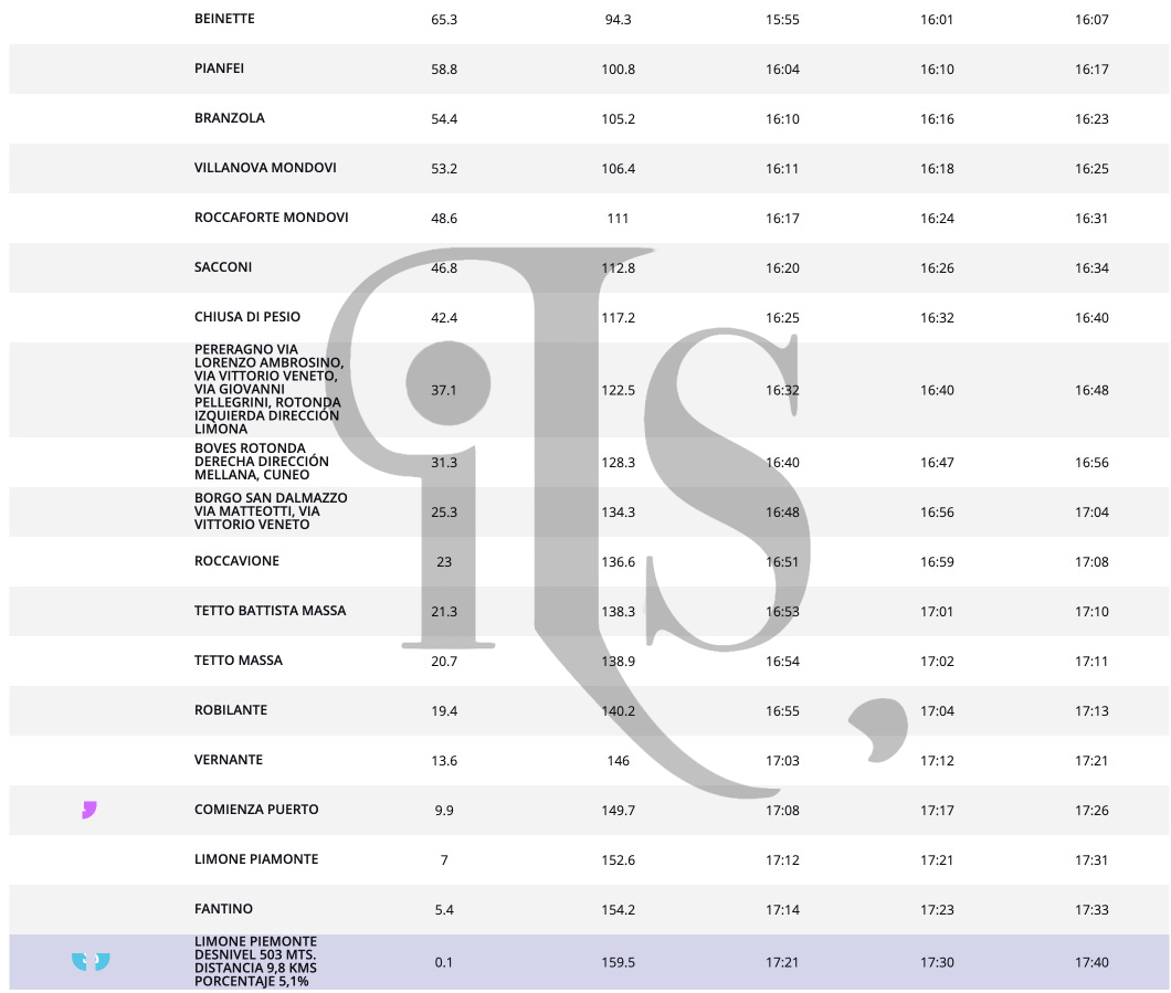 Di seguito, gli orari dei passaggi del giro nei vari Comuni cuneesi: