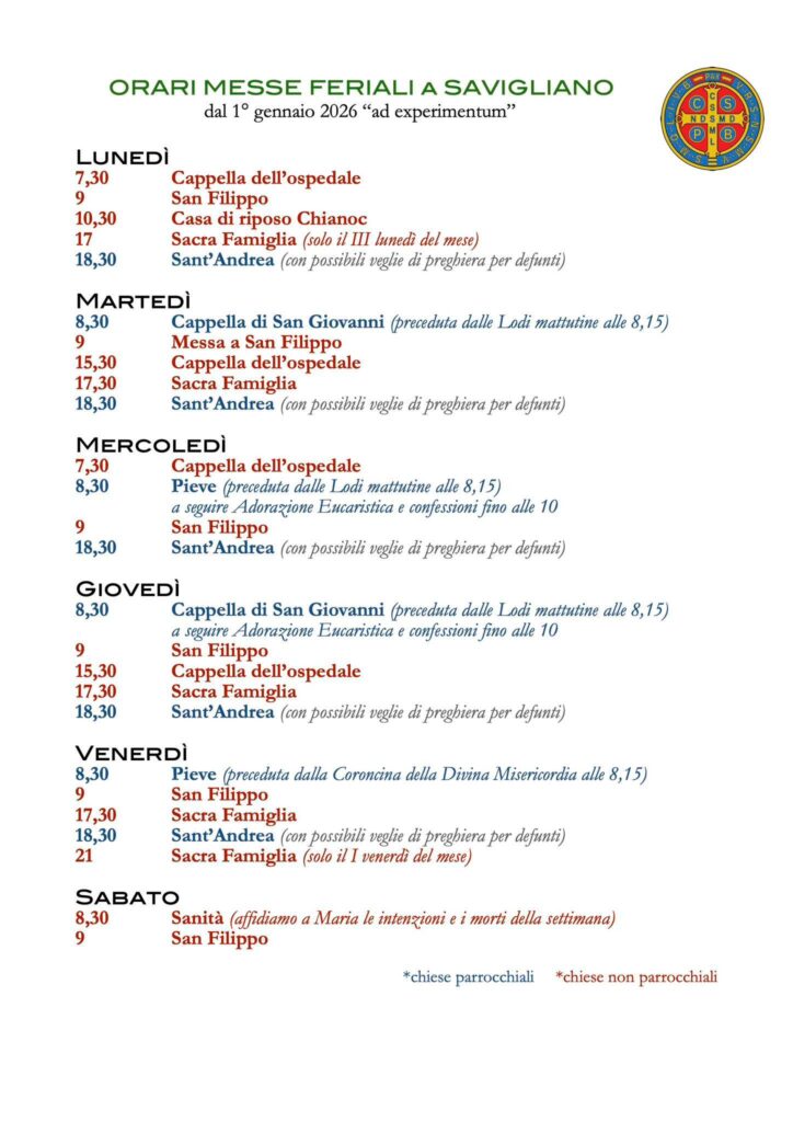 Il calendario tiene conto non solo delle chiese parrocchiali, ma anche degli altri luoghi di preghiera: la cappella dell’ospedale, la chiesa della Sacra Famiglia, la casa di riposo Chianoc, San Filippo, il santuario della Sanità e la chiesa di Madre Bonino. L’abate, in comunione con il clero e con le religiose della Sacra Famiglia, ha infatti sottolineato la necessità di evitare il più possibile sovrapposizioni tra le celebrazioni e di valorizzare le diverse parrocchie e chiese, ciascuna con un proprio ambito pastorale prevalente.