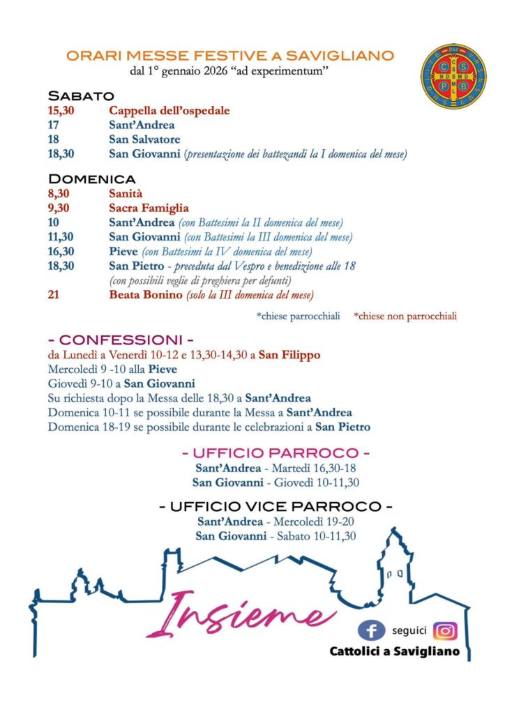 Vediamo come cambieranno le messe del fine settimana. Al sabato, la prima prefestiva sarà alle 15.30 all’ospedale; alle 17 ci sarà la messa a Sant’Andrea (prima era alle 18 in San Pietro), mentre la funzione delle 18.30 alla Pieve passerà a San Giovanni.